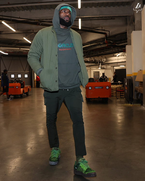在湖人对阵活塞赛前,詹姆斯又是早早来到球馆,入场时一脸严肃地表情。