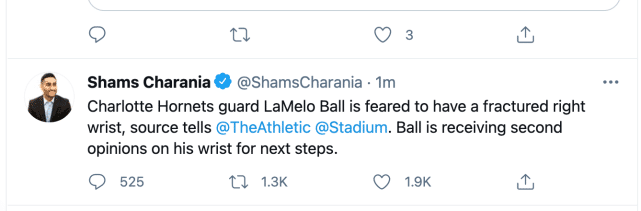 来源:JRS直播网03-22 17:08JRS直播网3月22日讯 ,根据名记Shams爆料,拉梅洛·鲍尔可能遭遇手腕骨折,预计会赛季报销。目前三球还在寻求诊断的第二意见。目前黄蜂更新了鲍尔的伤病报告,他将再度接受伤病评估,目前是无限期缺阵。对于黄蜂而言,这无疑是遭遇重创。