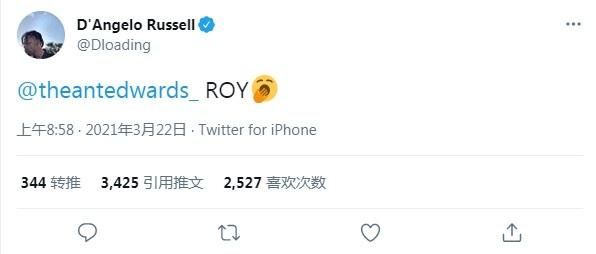 拉塞尔更新了推特动态写道:“@爱德华兹 年度最佳新秀。”要知道,就在大多数人为三球感到可惜,祝福他尽快康复的大环境下,拉塞尔如此表态是很让人不爽的,联想到昨日所罗门希尔无意伤了詹姆斯的情况下遭遇的抨击,网络轰炸拉塞尔完全是正常现象,随后他很快删除了推特!