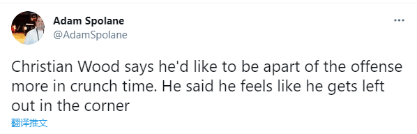伍德也抱怨球队没有团结在一起,更是直言他想要在关键时刻更多地参与进攻,他觉得自己被遗忘在角落里了;末节伍德仅仅出手两次,因此他对球队的现状也很不满,对于球权的分配也不满,恐怕火箭又要乱了,队内球员不团结,再加上长时间不赢球,队内矛盾随时都可能激化。