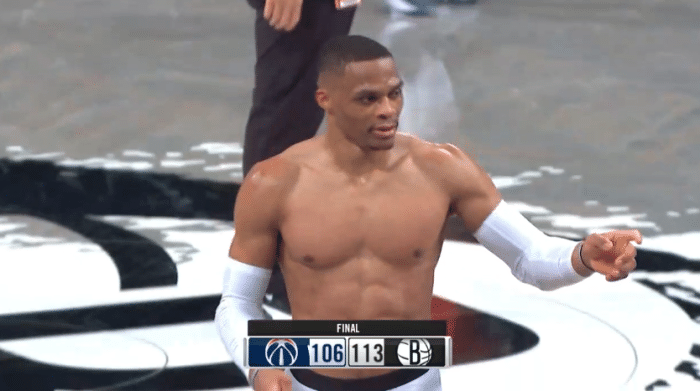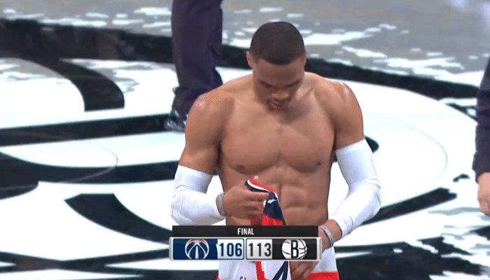 赛后韦少也脱掉球衣,光着膀子露出完美身材,腹肌全都显露出来;本场比赛,韦少轰下29分13篮板13助攻还有2次抢断,又砍下三双真是尽力了;开场5分钟,韦少带领奇才轰出20-6攻势,比赛悬念能够到最后,韦少也是居功至伟,神龟打球真是激情四射。