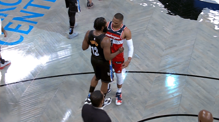 比赛期间,哈登和韦少偷偷拉手的亲密一幕被拍到,赛后两兄弟站在一起面对面畅聊,有说有笑太开心,期间格里芬、欧文等人都过来和韦少拥抱;上赛季哈登和韦少双MVP在火箭合作一年,结果季后赛早早出局,本赛季两人各自为主,韦少改披奇才4号球衣,哈登身穿篮网13号战袍,为冲击总冠军而战。