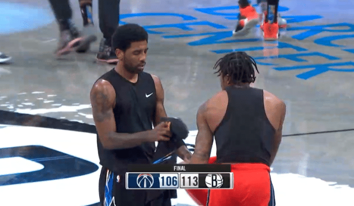 欧文则是脱掉球衣,和奇才球星比尔互换战袍,两人都拎着一件原味战袍返回更衣室,球星之间相互致敬,如此画面太暖心。