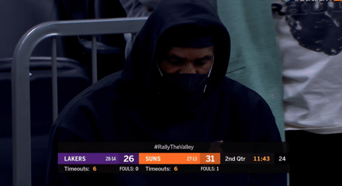 第二节开打没多久,镜头给到詹姆斯,当时浓眉站在詹姆斯身边探讨战术,老詹双眼紧盯着平板,十分认真;不过詹姆斯很低调,穿着一套黑色衣服,戴着黑色口罩,还戴着黑色卫衣的帽子;右脚上穿着保护靴,上一场比赛,詹姆斯的右脚踝被所罗门-希尔撞伤,归期未定。