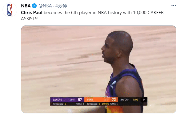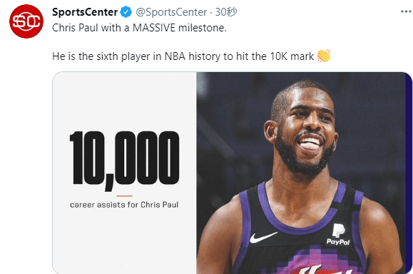 美媒Sport Center发推写道:保罗创造一项巨大的里程碑,历史第六位总助攻10000+的球员;NBA官方也是第一时间恭喜保罗创纪录。