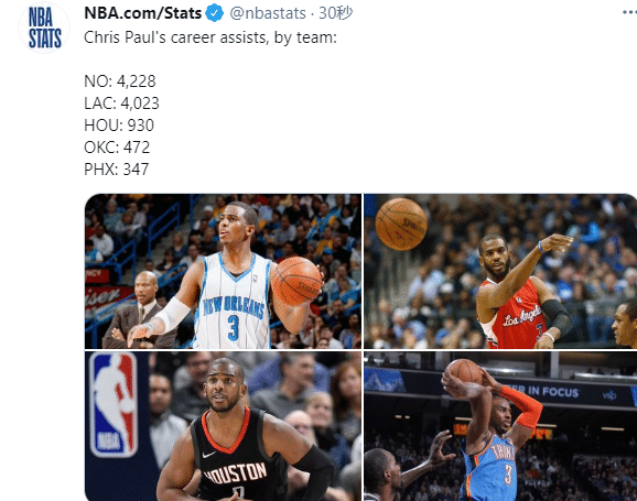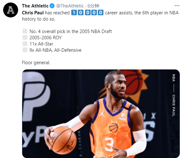 美媒TA发推写道:保罗正式达成10000助攻里程碑,成为历史第六人,并且列出保罗的荣誉:05年4号秀,最佳新秀、11次全明星和9次最佳阵容和最佳防守阵容。