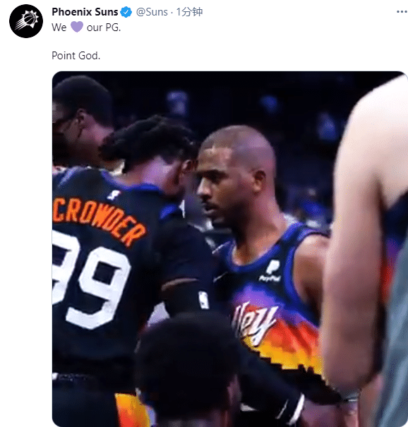 美媒Clutch Points发推写道:恭喜控卫之神;太阳官方连续更新动态,写道:我们爱我们的控卫,控卫之神;保罗助攻艾顿解锁神迹,回到太阳替补席,保罗拥抱克劳德,并且和众队友击掌庆祝。