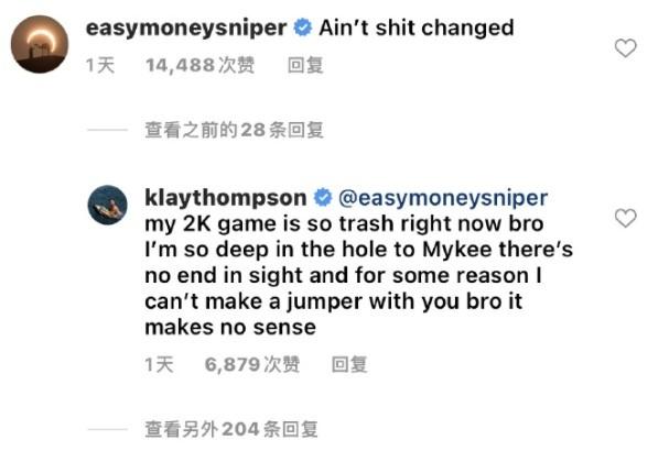 前队友杜兰特在评论区留言“啥都没变”然后克莱反问“我的2K水平现在垃圾得不行,我落后Mykee(克莱大哥)非常多,短时间内看不到追上的迹象。而且,不知道为什么,我在游戏里用你的时候,总是投不进跳投,这完全没道理啊。”