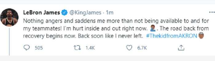 詹姆斯:没有什么比无法向我的球队和队友提供帮助更加愤怒和悲伤的事情了,我现在内外都受伤,现在就要开启复苏的道路了,我很快就将回来,就像当初的我没有离开时候一样,来自阿克伦的孩子。