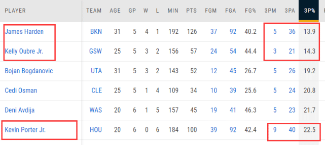 数据显示,全明星周末后累计三分出手至少20次的球员一共有101位,而哈登在这101位球员里三分命中率排名倒数第一,位列倒数第二的就是乌布雷。排在倒数第三至六位的依次是爵士射手博格达诺维奇(19.2%)、骑士前锋奥斯曼(20.8%)、奇才新秀阿夫迪亚(21.7%)和火箭小将波特(22.5%)。