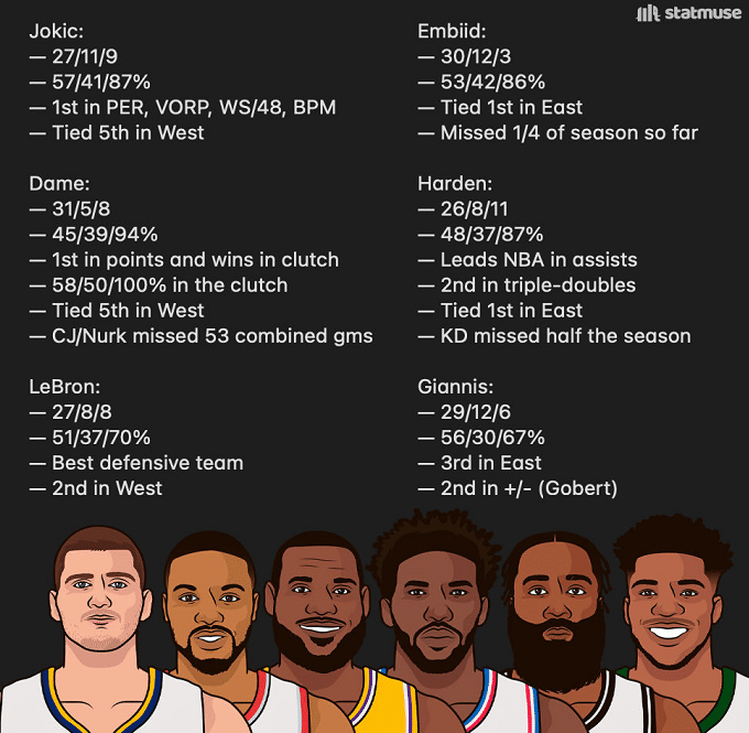 来源:JRS直播网03-20 14:46JRS直播网3月20日讯 今年NBA常规赛的MVP竞争是非常激烈的,在官方公布的新一期MVP榜单中,约基奇霸占榜首,利拉德和字母哥分居后面,詹姆斯、恩比德和哈登排名第4-6名。看起来每名球员在本赛季的表现都很出色,而现在比赛结束之后也会有不少的球员、教练和媒体人热议全明星的归属,现在看起来三人的可能性最大,詹姆斯、哈登和约基奇。