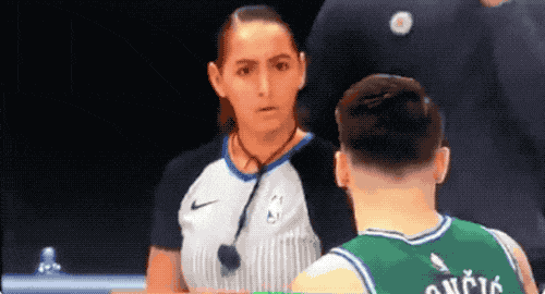 我们先来看看当时发生了什么,交流过程中,东契奇提到了此前的一个犯规,显然东契奇认为吹罚尺度有问题,在被东契奇质疑后,格莱希很不爽的反问:FOUL、FOUL?(什么犯规?什么犯规?)显然格莱希对于东契奇的言论感到不爽,甚至有发飙的迹象,这一切我们从她严肃的表情就可以看得出来。