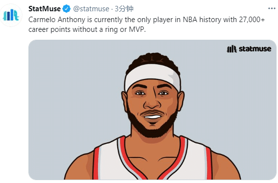 与此同时,安东尼也创造扎心纪录,成为NBA历史唯一一位总得分27000+却没有获得常规赛MVP或者总冠军的球员。