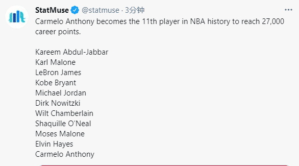 目前NBA历史上仅有11位常规赛得分突破27000分,排名依次是贾巴尔、卡尔-马龙、詹姆斯、科比、乔丹、诺维斯基、张伯伦、奥尼尔、摩西-马龙、埃尔文-海耶斯和安东尼;安东尼总得分正式突破27000分大关,目前安东尼距离海耶斯还差300多分,距离摩西-马龙400多分,本赛季有望杀进历史得分榜前十之列。