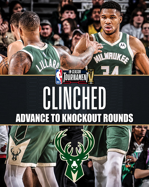 雄鹿客场击败热火,季中赛4胜0负以东部B组第一晋级八强,净胜分为46分,力压步行者以东部第一的身份晋级淘汰赛。