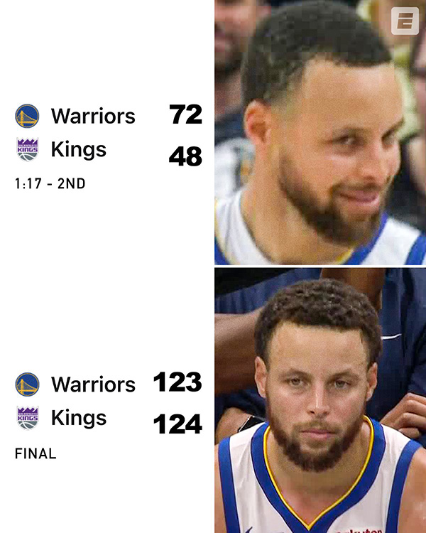 NBA季中小组赛收官日,与国王一战,勇士上下半场犹如两队,上半场最多领先24分,却在下半场惨遭逆转。