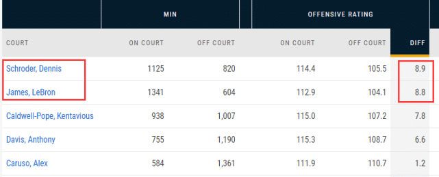 数据显示,赛季至今,施罗德在场时,湖人进攻百回合得114.4分,他不在场时,湖人进攻百回合只剩105.5分,二者之间的差别是8.9分。这数据排在湖人队第一。詹姆斯在场时,湖人进攻百回合112.9分,不在场时,进攻百回合104.1分,二者之间的差别是8.8分,排在湖人队第二。
