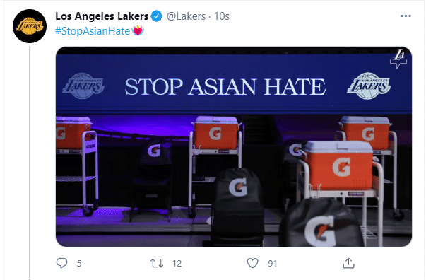 湖人官方声援亚裔群体!斯台普斯球馆打出标语:停止仇视亚裔