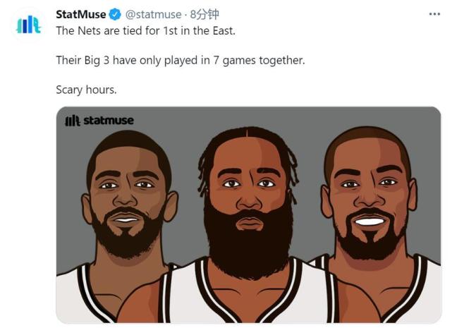 篮网逆转步行者一战之后也引发了热议,球队官方也颇为“凡尔赛”,他们在推特上发文:“有人更新NBA的排名吗?”美媒数据网站StatMuse就发出了三巨头的手绘合照,并配文:“篮网目前追平了东部第一,而杜兰特、哈登、欧文三巨头仅仅在一起打了7场比赛,太恐怖了。”