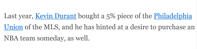值得一提的是,凯文-杜兰特也曾在采访中暗示,自己有未来购买一支NBA球队的想法。去年,他就买下了美国职业足球大联盟一支球队5%的股份,过了把小老板的瘾。
