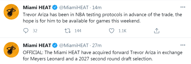 来源:JRS直播网03-18 19:18JRS直播网讯 北京时间3月18日,热火官方宣布,球队已经和雷霆正式完成交易,他们送出了梅耶斯-莱昂纳德和一个2027年的次轮签,得到雷霆的小前锋特雷沃-阿里扎。热火官方还表示,阿里扎有望在本周末的比赛中登场。