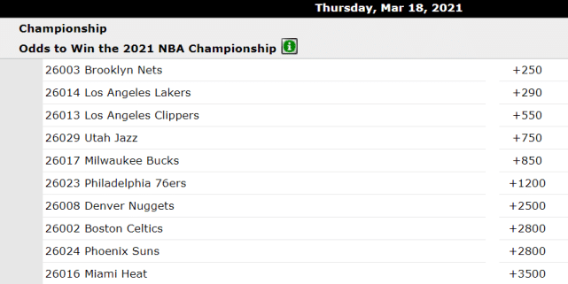 最新夺冠赔率出炉!篮网力压湖人排名第一 雄鹿引进塔克位居第五