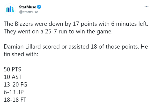 赛后第一时间,利拉德和这场比赛冲上热搜榜第一的位置。毕竟,这次17分大翻盘真是太传奇了!比赛还剩最后5分56秒时,鹈鹕还领先开拓者17分,几乎所有人都觉得这场比赛即将进入垃圾时间,但没想到进入的却是利拉德时间!