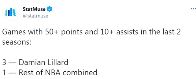 第二,过去两个赛季,全联盟一共出现4次得分助攻50+10的表现,而利拉德一人就占了其中3次。