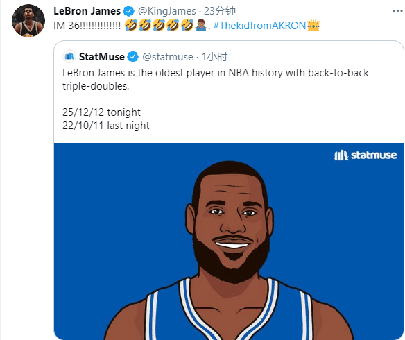 36岁詹姆斯又打出统治力,赛后他转发自己创下的最老三双纪录,并且发推写道:我36岁了!(后面省略14个感叹号)5个哭笑不得的表情#来自阿克伦的小孩。