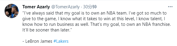 赛后詹姆斯再次谈到自己未来的目标:我经常说我的目标是拥有一支NBA球队。我有很多经验可以分享,我知道如何赢下比赛,我知道哪些球员有天赋,我也知道该如何去运作,拥有一支NBA球队是我的目标,这是迟早会发的事情!