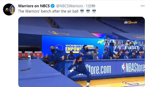 现场解说忍不住哈哈大笑,勇士替补席疯狂庆祝,库里坐在替补席哈哈大笑,还抱头做出不敢相信的手势,格林站起来咧嘴大笑,并且大喊That's air ball,勇士其他球员则是做出各种庆祝姿势;不知道情况的,还以为勇士打出不可思议的进球,可实际情况是库兹马罚球太偏,直接三不沾成大笑话。