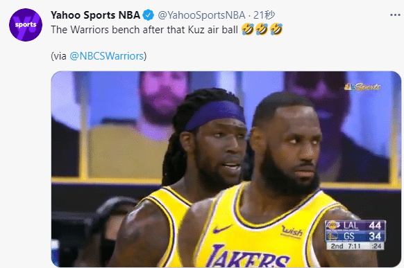 当时镜头也拍到詹姆斯和哈雷尔的反应,两人表情都十分抢镜,库兹马自己也十分尴尬,然后用笑声掩盖尴尬;美媒疯狂转发库兹马罚球三不沾点燃勇士替补席;哈雷尔挨肘换来的技犯,库兹马居然罚偏了,而且偏的有些离谱,难怪众美媒集体嘲笑他。