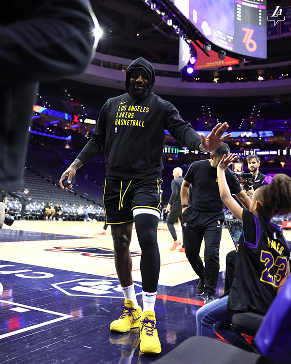 对阵费城赛前,詹姆斯职业生涯的总上场时间仅仅比贾巴尔少9分钟,比赛开打后,詹姆斯继续身穿湖人23号球衣,搭档浓眉、拉塞尔等人首发出战,詹眉带队开场与76人对攻,可之后湖人集体哑火被费城一波20-2拉开分差,湖人首节19-32落后13分。