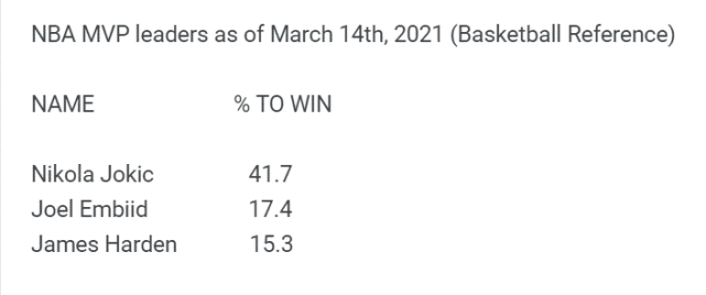 换言之,只要哈登在下一场对尼克斯的比赛中至少拿到22分7助攻,就能在总得分和总助攻上超越两大名宿。篮网一直在赢球,而哈登在官方最近一期的MVP榜单上只排在第8位,引起很多球迷的不满。知名数据网站Basketball-Reference也有一个MVP当选概率的榜单,这是基于往届投票结果的数据模型。目前,哈登在这份榜单上的MVP当选概率排名第三,达到15.3%,仅次于约基奇(41.7%)和恩比德(17.4%)。