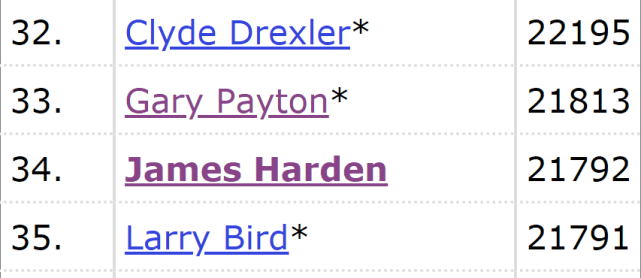 数据显示,哈登目前生涯总得分达到21792分,距离排名第33位的加里-佩顿只差21分。身为9届全明星,绰号“手套”的佩顿生涯出战1335场,累计得到21813分。只要哈登下一场比赛得到22分,就能超过佩顿,升至历史得分榜的第33位。对于场均25.2分的哈登来说,这是很有可能实现的。