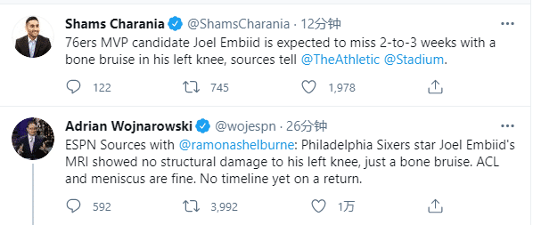 恩比德是在费城和奇才比赛中受伤的,当时他完成扣篮后落地时抻到膝盖,左膝反关节过度伸展,一瘸一拐返回更衣室,初步确诊为左膝拉伤;如今26岁恩比德真实伤情确诊,左膝骨头瘀伤,预计伤停2-3周,半月板和十字韧带都完好无损。