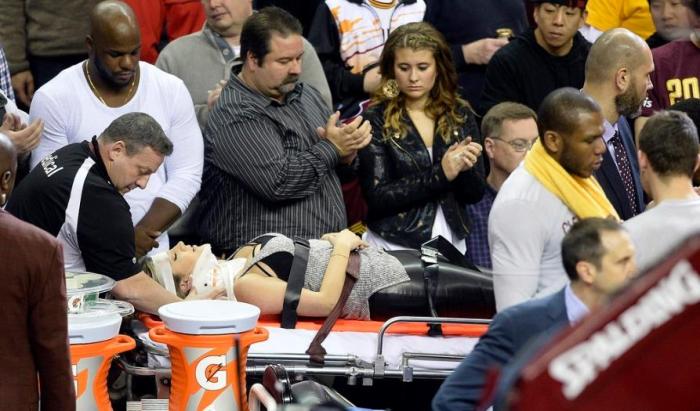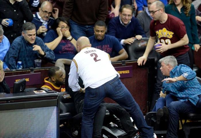 2015年12月18日,杜兰特的雷霆队客场挑战詹姆斯所在的骑士队,现在VS未来,比赛打得非常激烈,比赛进行到最后三分钟的时候,詹姆斯上演了玩命救球的一幕,老詹飞身而出也是直接砸在了一个女球迷身上,被全速的詹姆斯砸到身上,该女球迷躺在地上久久不能起身。