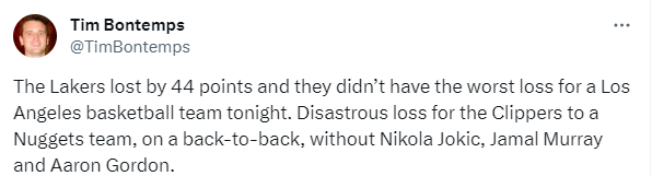 快船面对掘金遭遇8连败,他们已经快2年没有赢过掘金了;快船输球引热议,名记Tim Bontemps吐槽快船输得比湖人还惨,发推写道:湖人今晚输了44分,而他们并非洛杉矶输得最惨的球队。快船输给掘金简直灾难,掘金背靠背,还少了约基奇、穆雷和阿隆-戈登。