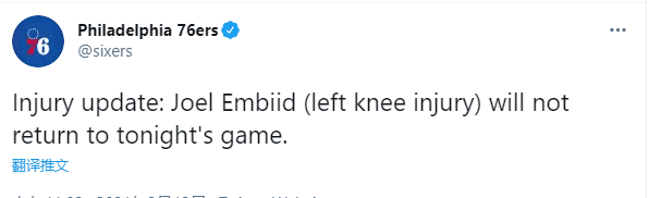 据ESPN名记报道,恩比德伤情初步确诊为过度伸展,他将会接受核磁共振的检查,从而进一步确诊伤情,本场比赛不会回归;随后费城官方也正式宣布,恩比德因左膝受伤直接退出本场比赛。