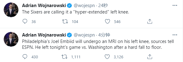 官宣!恩比德伤情初步确诊,左膝反关节拉伤,仅打20分钟便因伤退赛