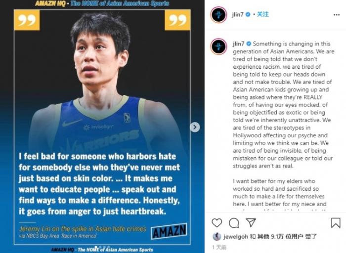 此事发生在2月27日,当时的林书豪突然在社媒上发表了长文来抨击歧视亚裔的行为“对于这一代的亚裔美国人,有些事情必须要改变了。我们厌倦了被告知没有遭遇种族歧视,厌倦了被告知必须低头不要制造麻烦。我们受够了自己的孩子长大过程中一直被问他们到底来自哪里,受够了孩子们的眼睛被嘲笑,受够了孩子们被物化为异类,被告知根本没有吸引力。我们受够了好莱坞影片中对于亚裔的刻板印象如何影响着我们的思想,限制我们认为自己可以成为的样子。我们厌倦了被无视,被同事误解···”