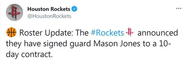 来源:JRS直播网03-13 09:56JRS直播网3月13日讯 北京时间3月13日,火箭官方宣布,他们已经和旧将梅森-琼斯签下一份10天短合同。4天前,为了给安东尼-兰姆腾出空间,火箭裁掉了琼斯。如今,火箭重新签下这位22岁的射手,更多是为了凑足联盟规定的最低上场人数。