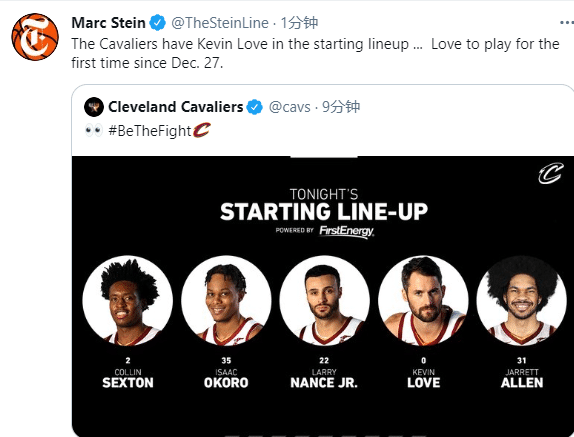 来源:JRS直播网03-13 09:49JRS直播网3月13日讯 骑士球星凯文-乐福终于伤愈复出,骑士已经官宣首发阵容,乐福搭配塞克斯顿、奥科罗、小南斯和艾伦一起首发出战,不过乐福将会有出场时间限制,毕竟他已经两个半月没有打过比赛,伤愈归来的第一场比赛,确实不能打太久。