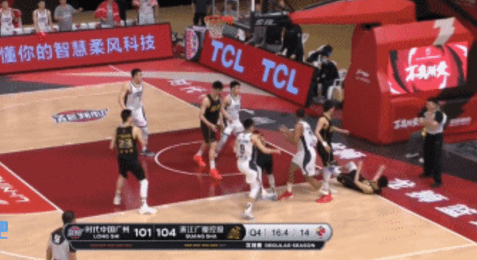 广州101-104落后广厦,不过他们有球权,摩尔出手三分球不中,祝铭震摘板之后补篮也没有投进。摩尔抢到前场篮板之后分球,陈盈骏出手投篮,可惜空位三分球不中,这个时候裁判的哨声响了,他示意在抢篮板的时候祝铭震对孙铭徽的犯规,然后孙铭徽两罚全中,在还剩下16.4秒的情况下分差拉大到5分,比赛胜负的悬念也基本上提前消失。