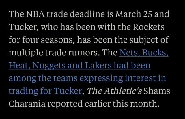 费根报道称,35岁的塔克想要前往有希望竞争总冠军的球队打球。这是他效力火箭的第四个赛季,他决定离开这支球队。两个消息源透露,火箭的交易目标是用塔克换来一个年轻球员,而不只是收集选秀签。