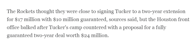 ESPN报道称,火箭方面认为赛季初他们接近和塔克达成一份2年1700万的续约协议,其中1000万美元是保障部分。而塔克的阵营要求火箭提供2年2400万的合同,且全额保障。最终,双方不欢而散。