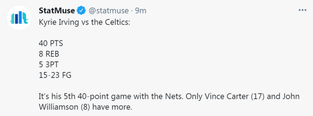 数据网站StaMuse指出,这场比赛,也是欧文加盟篮网后的第5场得分40+的比赛,目前,他在这项数据上已经排名篮网队史第三,仅次于卡特(17场40+)和约翰-威廉姆森(8场40+)。值得一提的是算上这场球,欧文才为篮网打了47场比赛而已,他已经有一项数据能达到队史第三的水准了。有球迷调侃道,一方面说明欧文得分能力够出色,但另一方面也说明篮网队史家底薄,没有太牛的超巨。