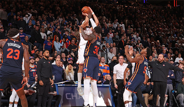 当布伦森跳投命中的时候,比赛还剩下21.9秒,双方战成平手,太阳手握最后一次进攻,拥有绝杀的机会。布克顶着两人的防守,急停出手三分球命中,完成准绝杀的好戏,非常精彩。当布克命中三分球之后,麦迪逊广场花园几乎变成图书馆一般寂静,球迷们抱着脑袋,失望透顶。