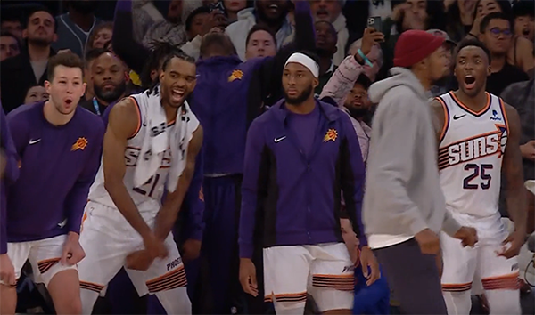 太阳的球员们疯狂,此役没有上场的杜兰特穿着便装、戴着小红帽,在场边踱步。一旁的队友们疯狂庆祝,尼克斯暂停,太阳的球员们上前祝贺布克投进了如此关键的一球,展现出大心脏的属性。