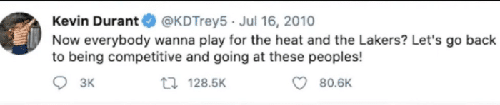 值得一提的是在2010年7月8日,詹姆斯宣布的加盟热火,所以当时加入联盟三年的杜兰特很显然是看到了小皇帝离开了自己的家乡球队克利夫兰,选择去到迈阿密才发布了这样的动态。